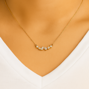 שרשרת יהלומים מזהב 14 קראט בעיצוב טיפה וריבוע, המתאפיינת במראה אלגנטי, מאוזן ועל־זמני. שילוב ההרמוני בין עיצוב ייחודי ליהלומים טבעיים יוצר תכשיט שמאיר את המראה באופן טבעי, ללא קשר תשומת לב יתרה. מדובר בפריט המתאים לשימוש יומיומי חכם והן להופעות ערב מרשימות.