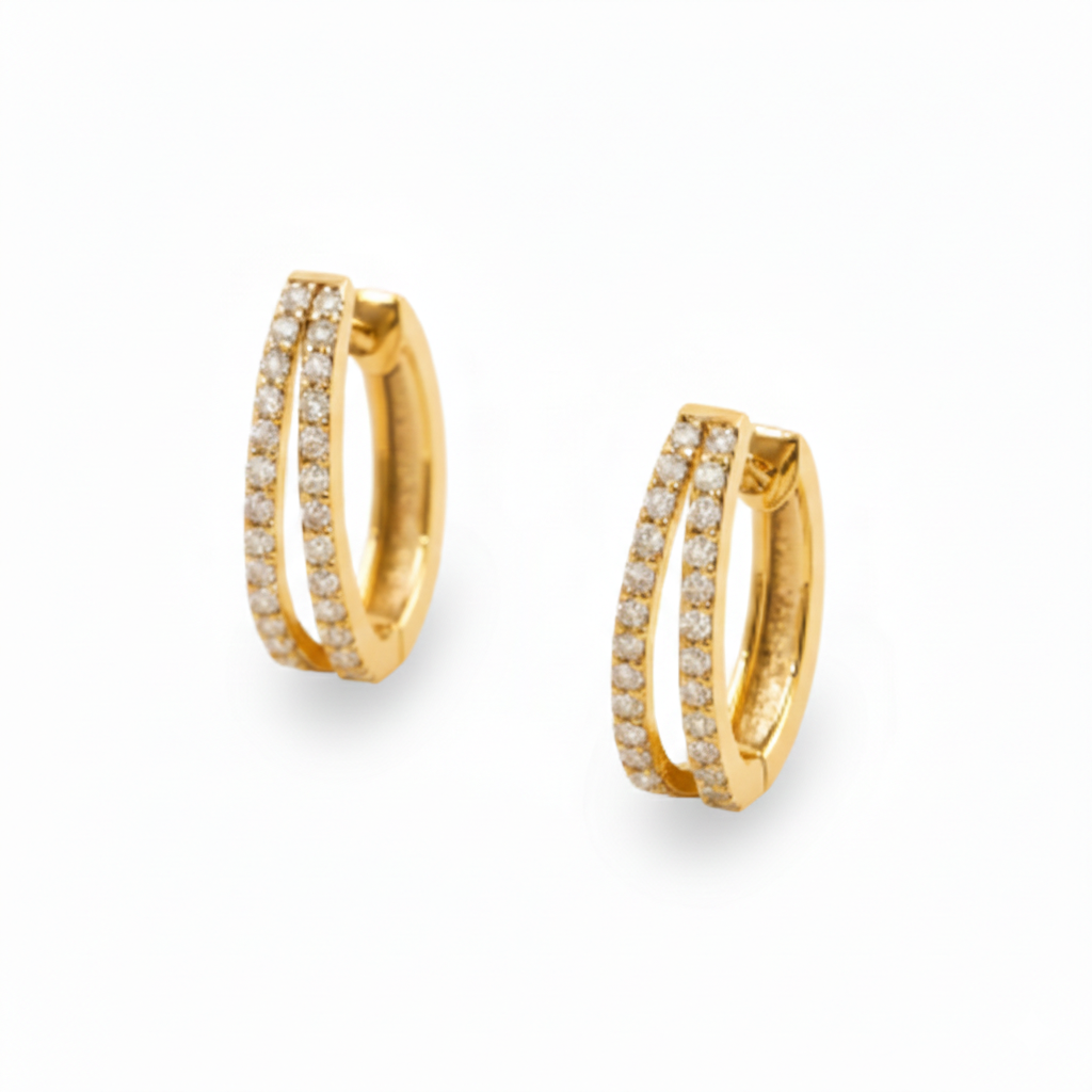 עגילי יהלומים מזהב 14 קראט בעיצוב חישוק אלגנטי ונקי. השיבוץ המדויק מדגיש את הברק של היהלומים ומשלים מראה מאוזן ונעים לעין.