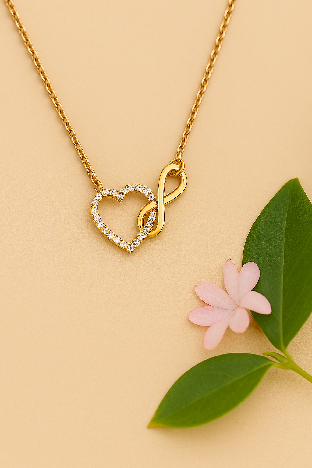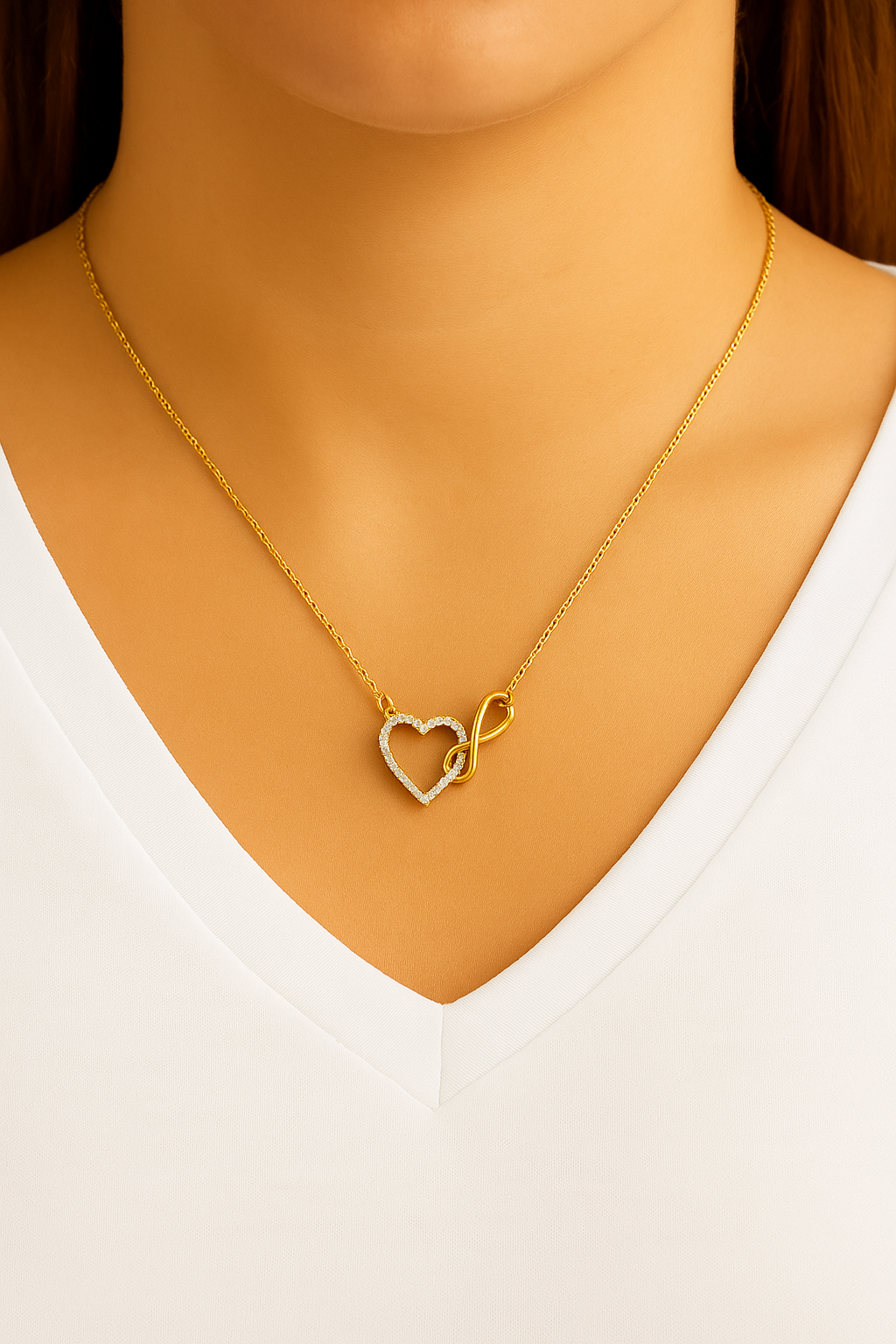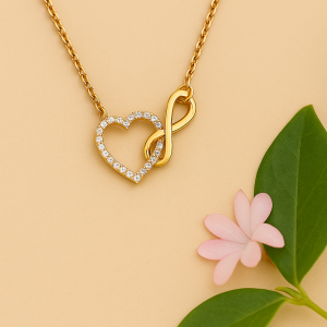 שרשרת יהלומים מזהב 14 קראט בעיצוב לב אינפיניטי, בעל מראה אלגנטי ומעודן עם נוכחות יוקרתית אך מאוזנת.